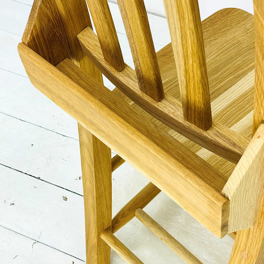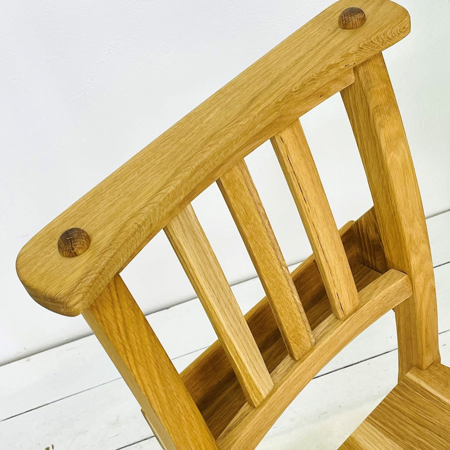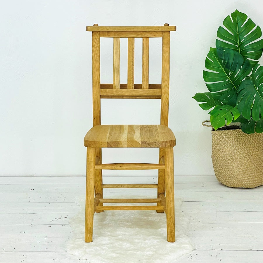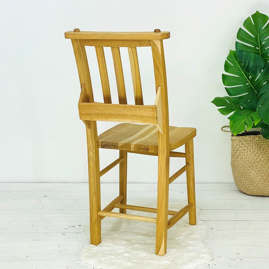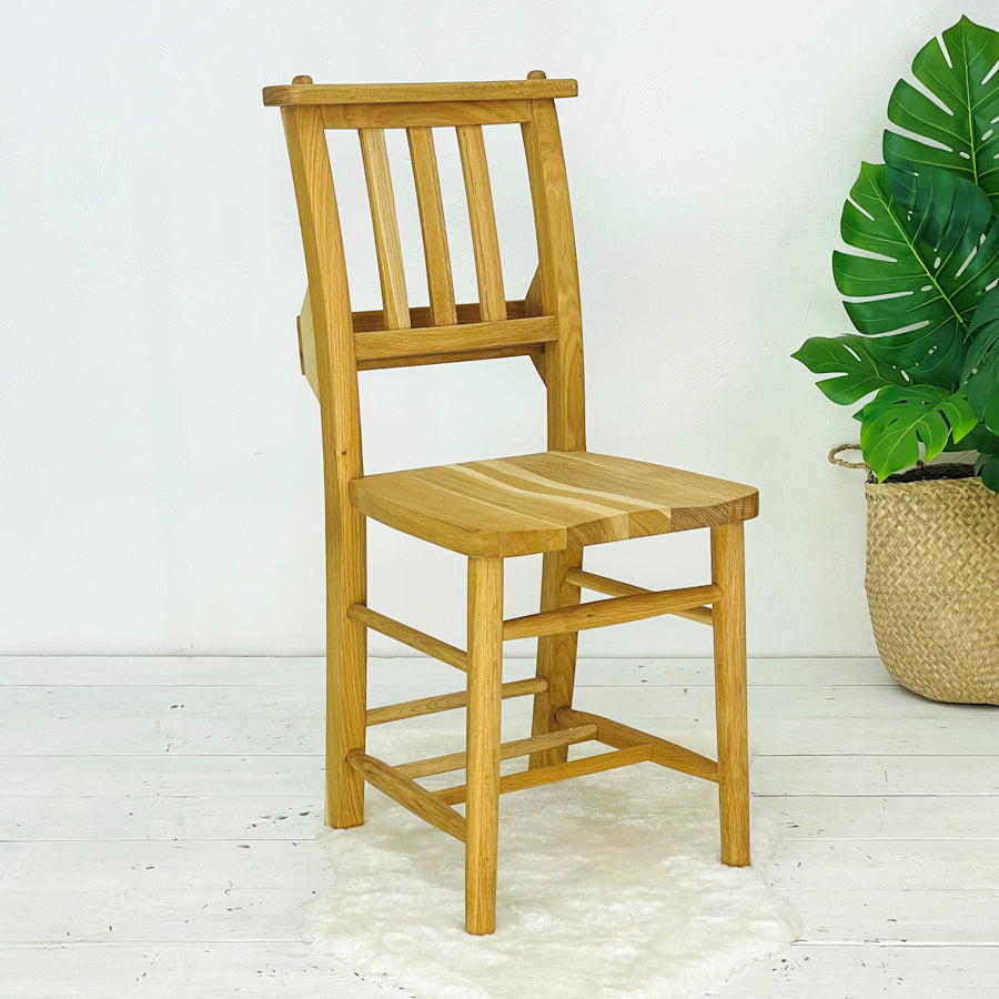 Our Church Chair is made of solid oak and designed with style and practicality in mind. Featuring a discreet book/storage boxed shelf on the rear of the backrest; handy for small dining items like napkins and placemats, or colouring books and pencils for your little people. This cleverly adds a functional aspect to your dining experience, keeping essentials within easy reach while maintaining a tidy dining space.